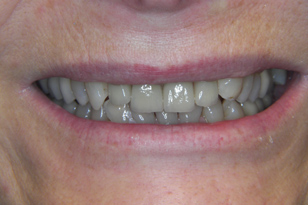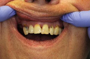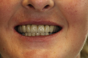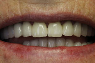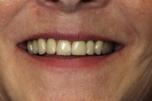 Coroas de porcelana e.max superiores com porcelana fundida ao metal na parte posterior em novembro/dezembro de 2012