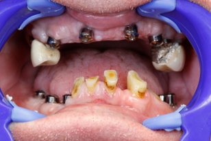 A foto foi tirada pouco antes do início da fase final, com os implantes já posicionados (algumas tampas de cicatrização visíveis)
